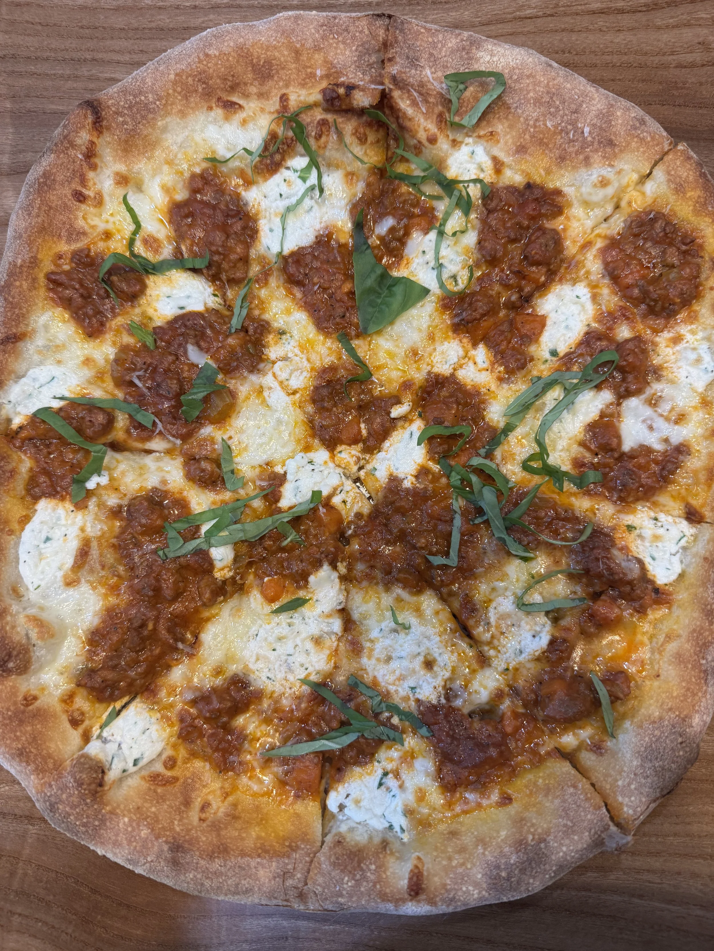 Bolognese: Traditional meat ragu, creamy ricotta, mozzarella, basil
