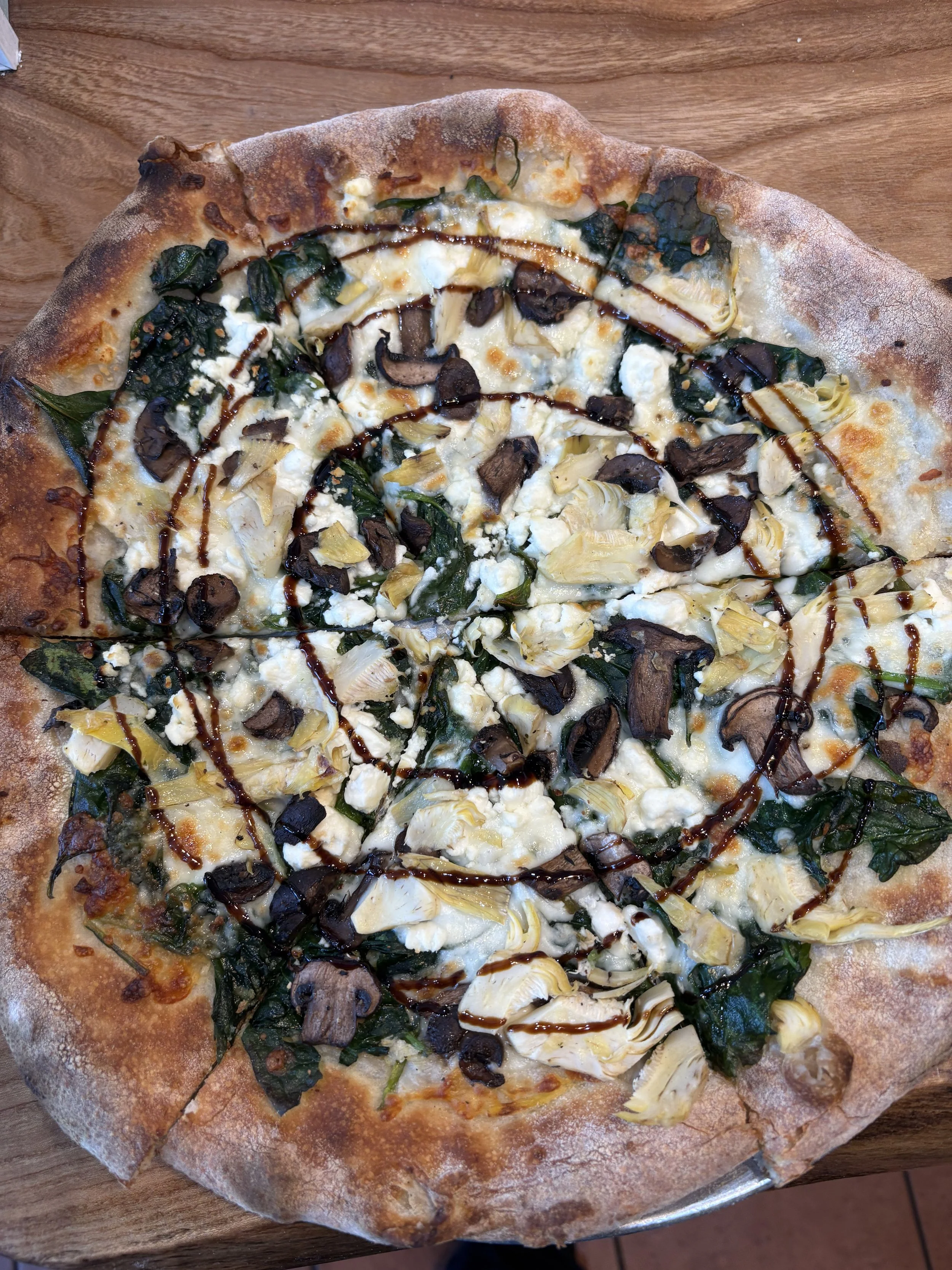 White pie, herb-roasted mushrooms, goat cheese, umami mushroom sauce & scallions