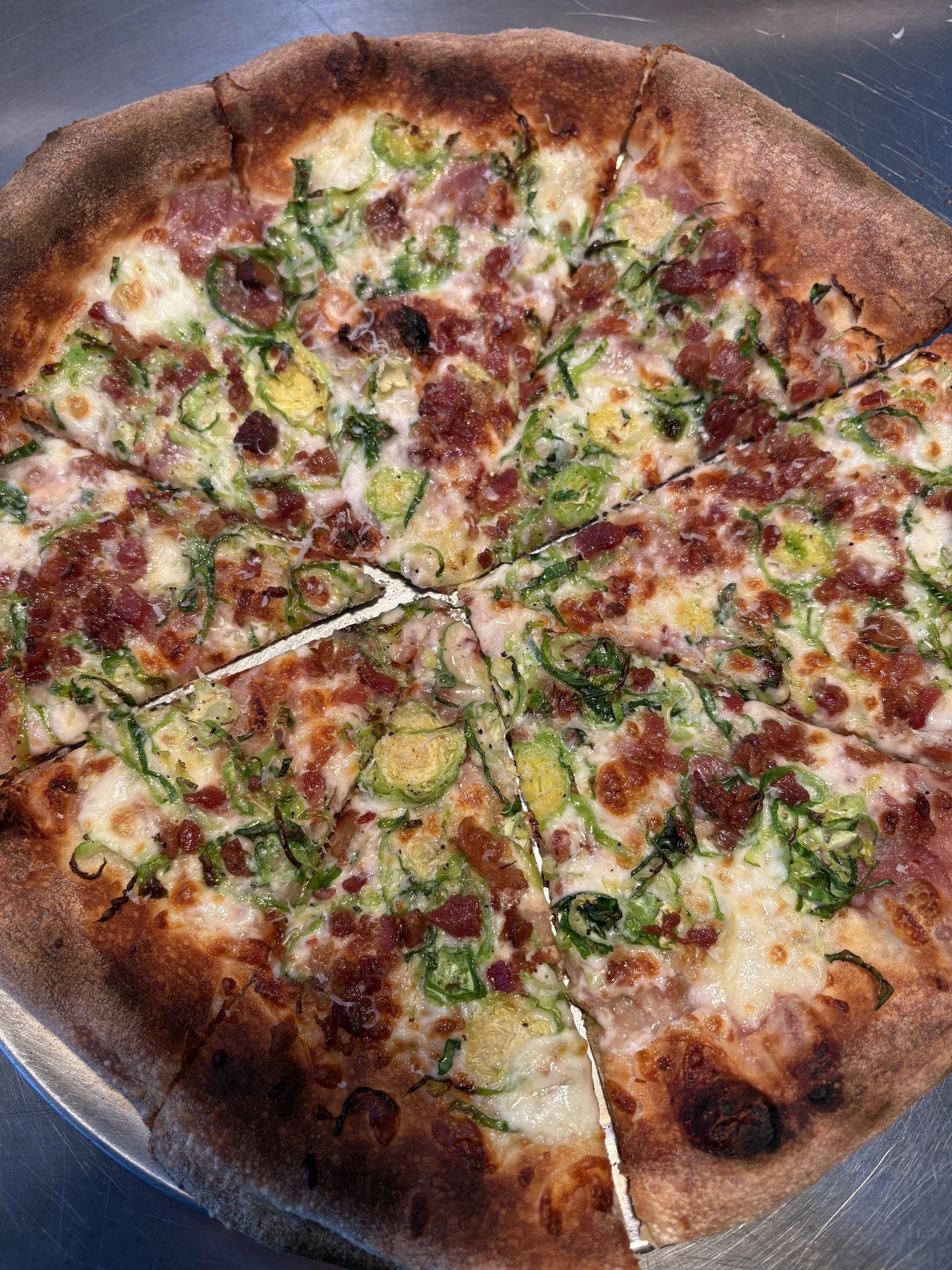 Brussel-mania: White pie, shaved Brussels sprouts, caramelized onion jam, bacon, brie cream, mozzarella