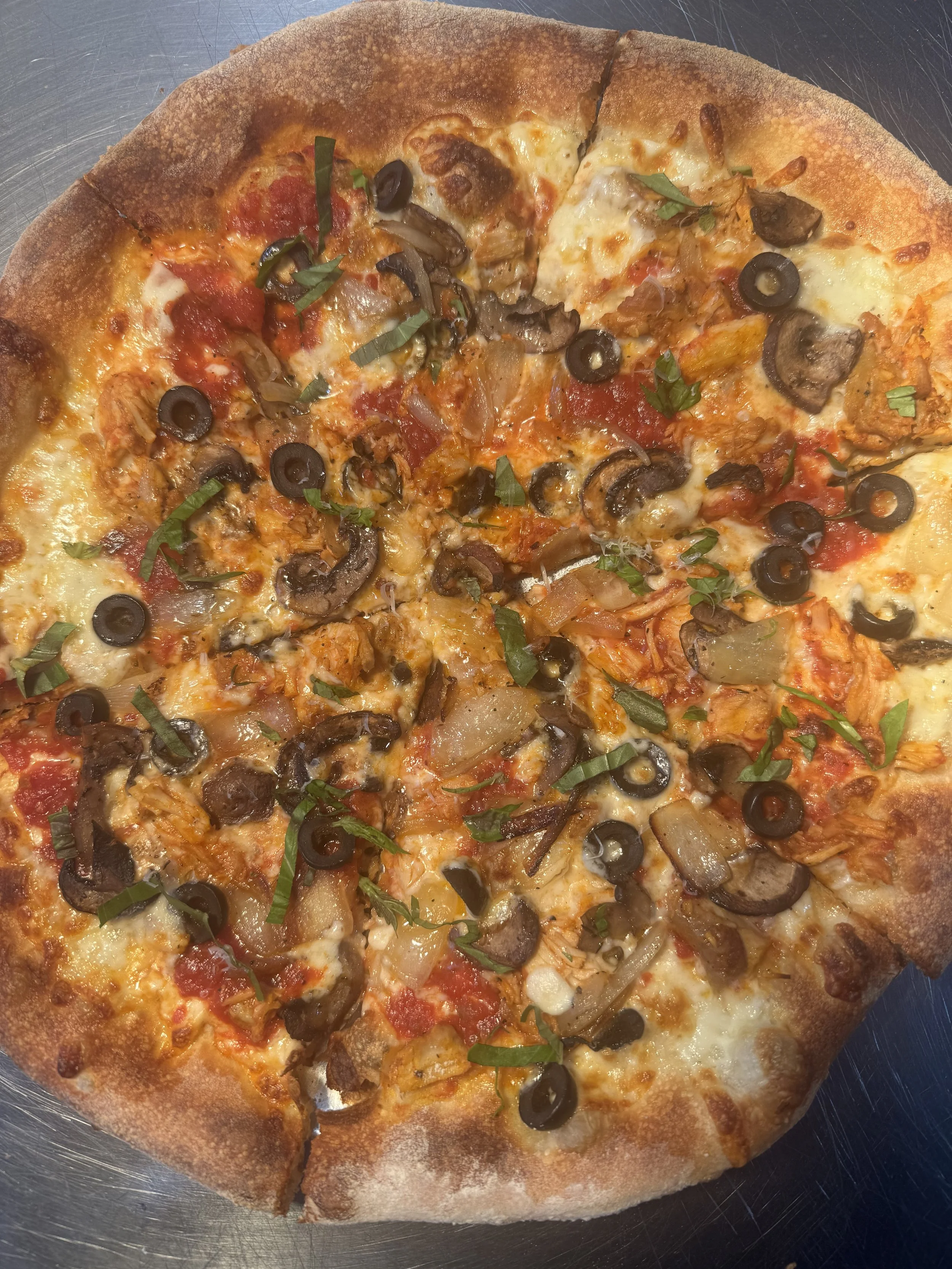 Happy Hunting (The Cacciatore Pie): Our take on Chicken Cacciatore: tender braised chicken, wine-infused sauce, mushrooms, onions, olives, mozzarella, basil